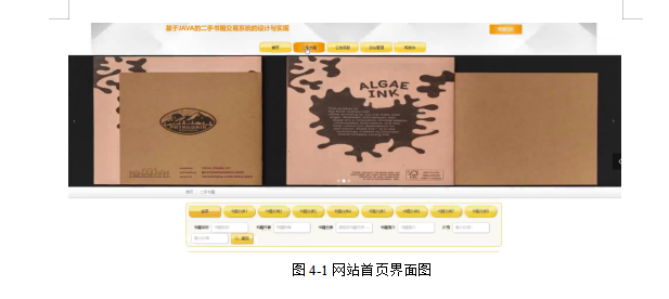 网站首页页面主要包括首页、二手书籍、公告信息、后台管理、购物车等内容,并根据需要进行详细操作;如图4-1所示: