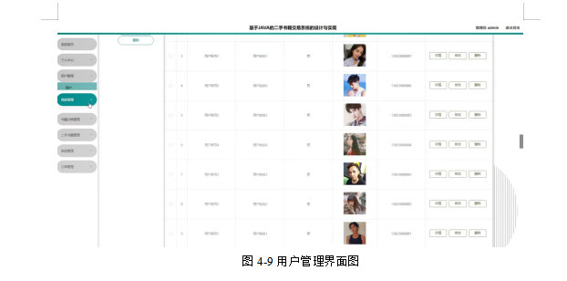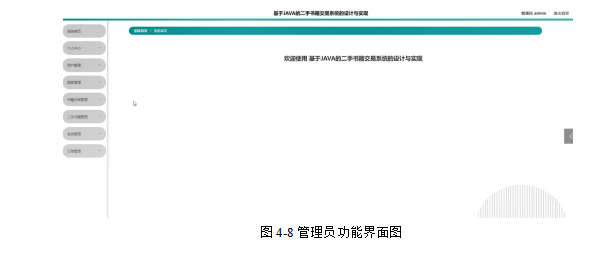 管理员登录进入二手书籍交易系统可以对系统首页、个人中心、用户管理、商家管理、书籍分类管理、二手书籍管理、系统管理、订单管理等信息,进行相应操作,如图4-8所示。