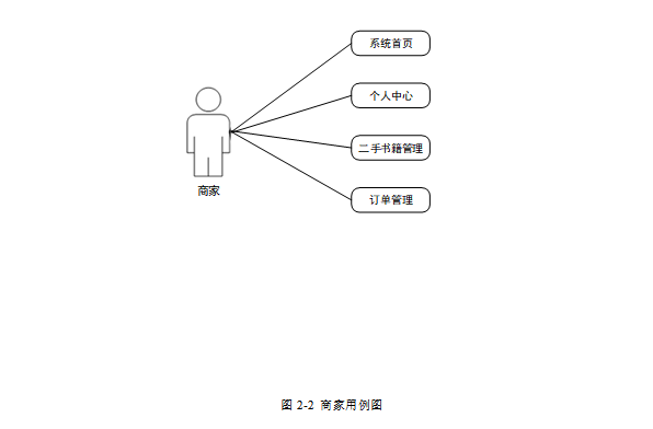 其中使用者为商家。具备有:系统首页、个人中心、二手书籍管理、订单管理功能。商家用例图如图2-2所示。