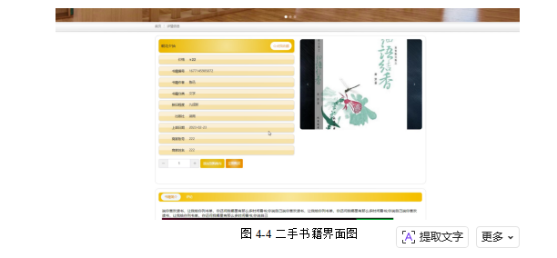 用户点击二手书籍,在二手书籍页面的搜索栏输入书籍编号、书籍名称,进行查询,也可以查看书籍编号、书籍名称、书籍封面、书籍作者、书籍分类、新旧程度、出版社、上架日期、商家账号、商家姓名、价格等内容,如有需要可以添加到购物车、立即购买、收藏或者评论等操作;如图4-4所示。
