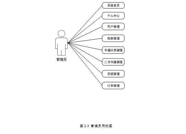 进行维护,以及平台的后台管理工作都依靠管理员,其可以对一些信息进行管理。需具备功能有;系统首页、个人中心、用户管理、商家管理、书籍分类管理、二手书籍管理、系统管理、订单管理。管理员用例图如图2-3所示。