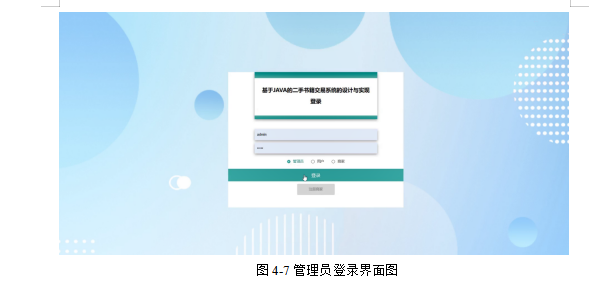 管理员登录,通过登录页面输入用户名、密码、选择角色等信息,进行登录操作,如图4-7所示。
