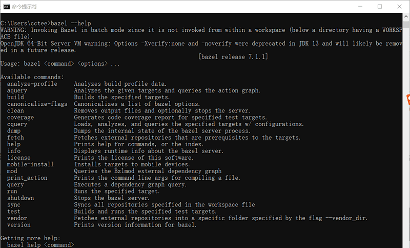 3) 打开 cmd 命令窗口输入 bazel --help 出现如下输出即为安装成功: