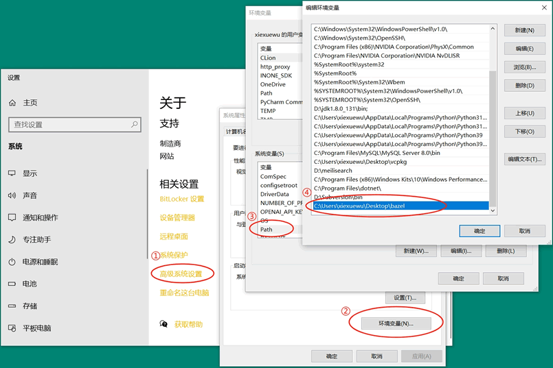 2) 将保存 Bazel.exe 的文件夹路径加入环境变量: