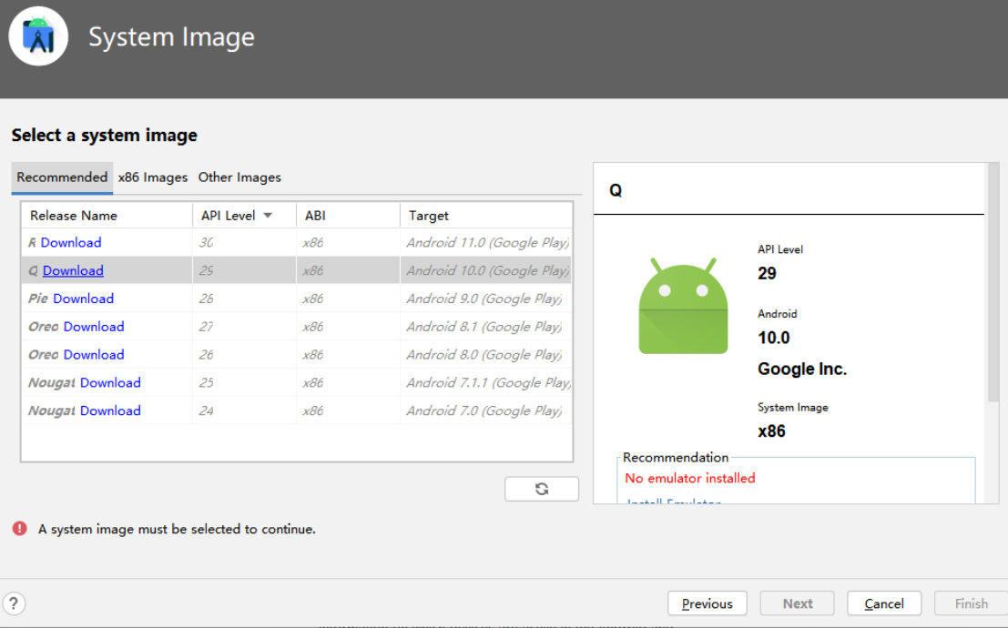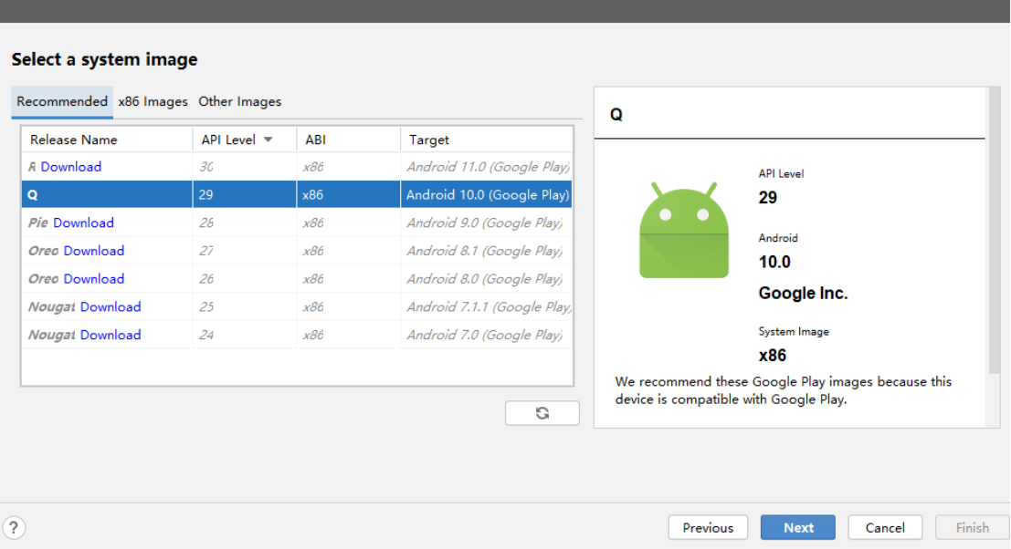 在系统镜像选择界面,推荐选择API 29(Android 10)