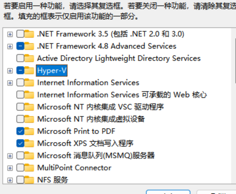 在弹出窗口中找到"Hyper-V"并勾选
