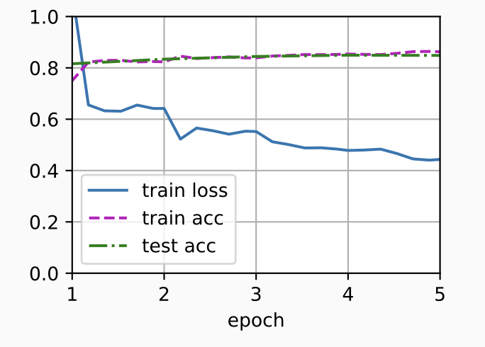d2l.train_ch13(net, train_iter, test_iter, loss, trainer, num_epochs, devices)输出: