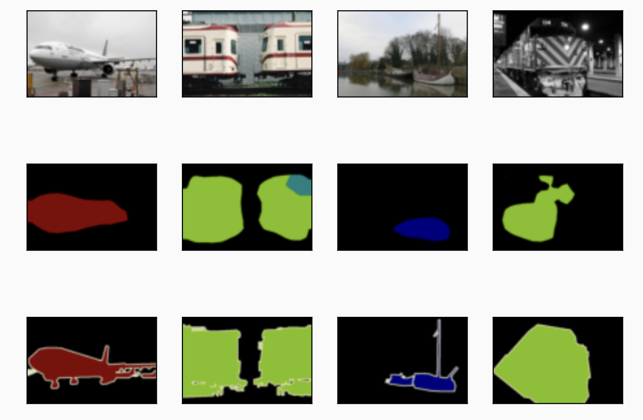 for i in range(n):crop_rect = (0, 0, 320, 480)X = torchvision.transforms.functional.crop(test_images[i], *crop_rect)pred = label2image(predict(X))imgs += [X.permute(1,2,0), pred.cpu(),torchvision.transforms.functional.crop(test_labels[i], *crop_rect).permute(1,2,0)]