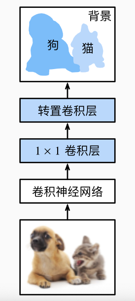 全卷积网络先使用卷积神经网络抽取图像特征,然后通过1*1卷积层将通道数变换为类别个数,最后通过转置卷积层将特征图的高和宽变换为输入图像的尺寸。