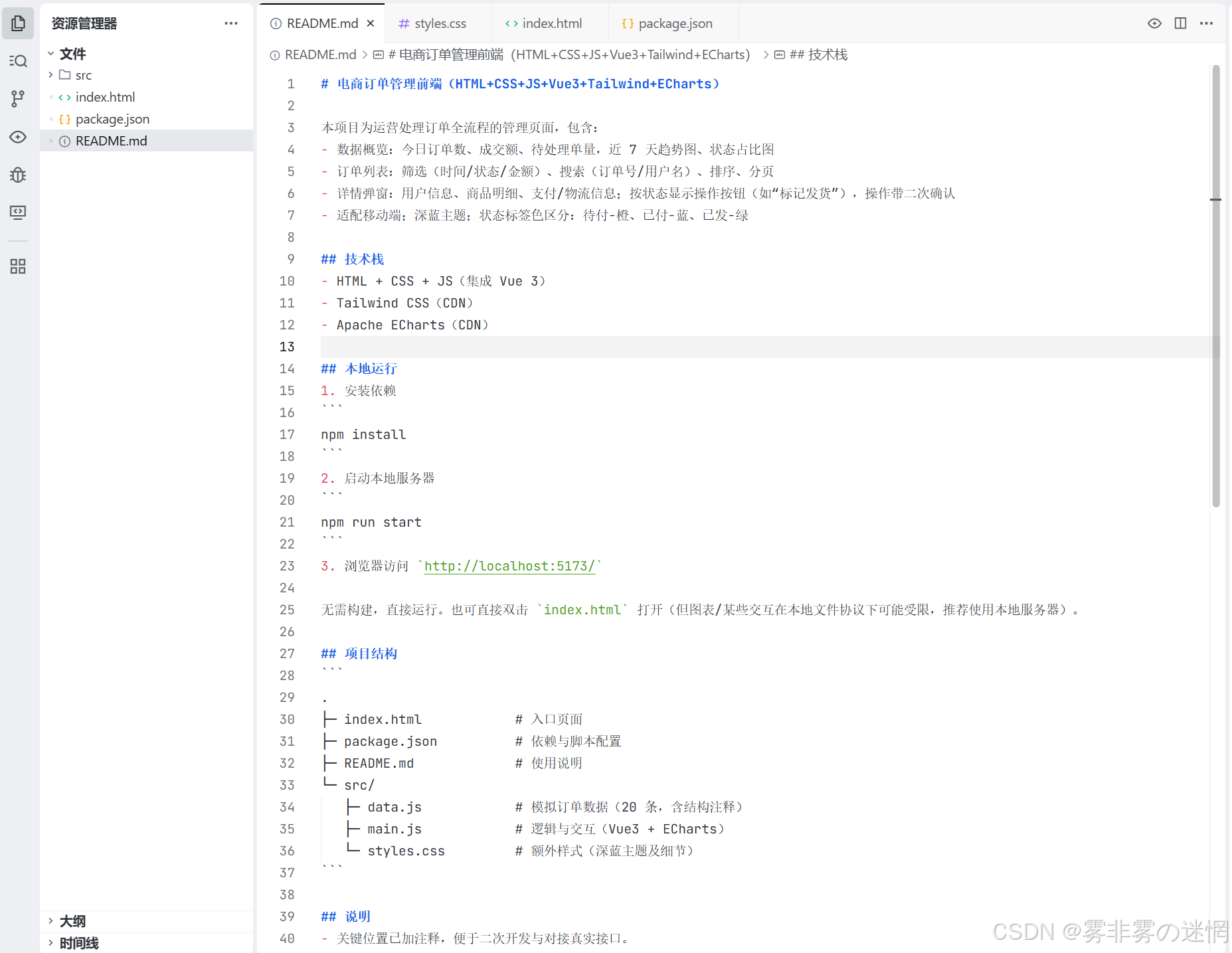 项目结构- index.html :页面结构与 UI(集成 Tailwind/Vue3/ECharts)