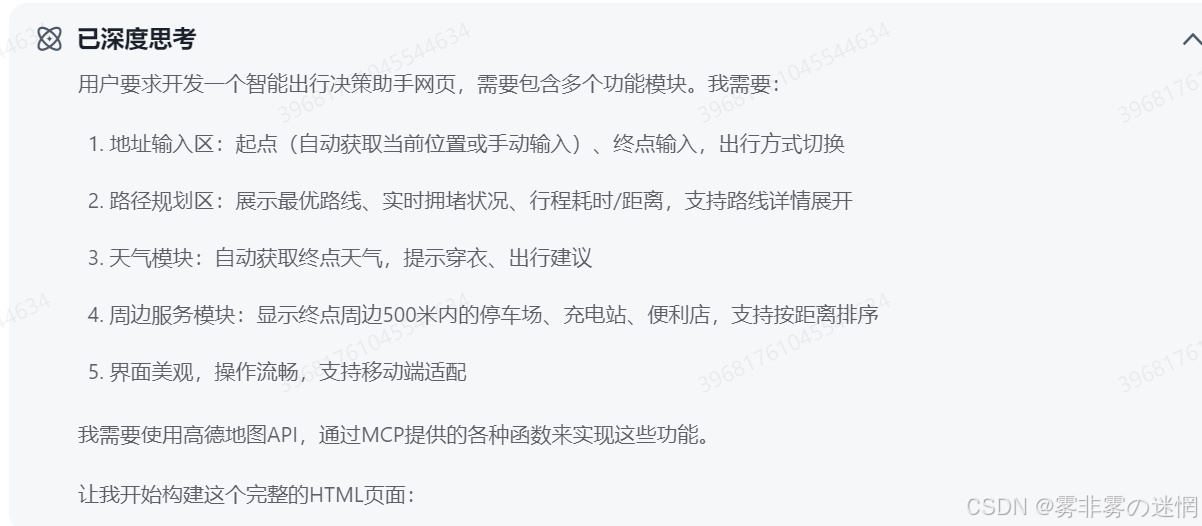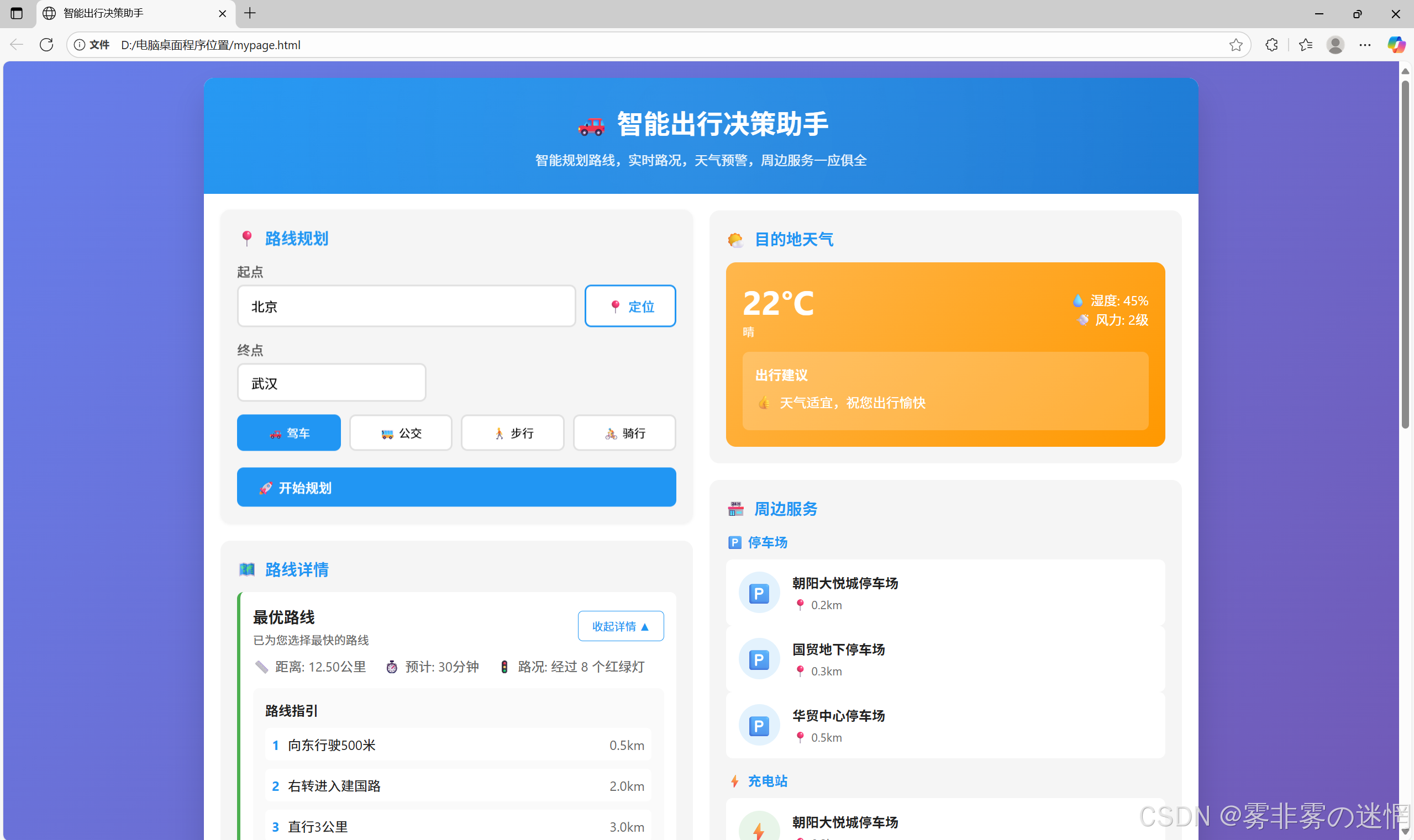 请使用 HTML、CSS、JavaScript 和高德地图 MCP,开发一个 “智能出行决策助手” 网页。需包含以下模块: