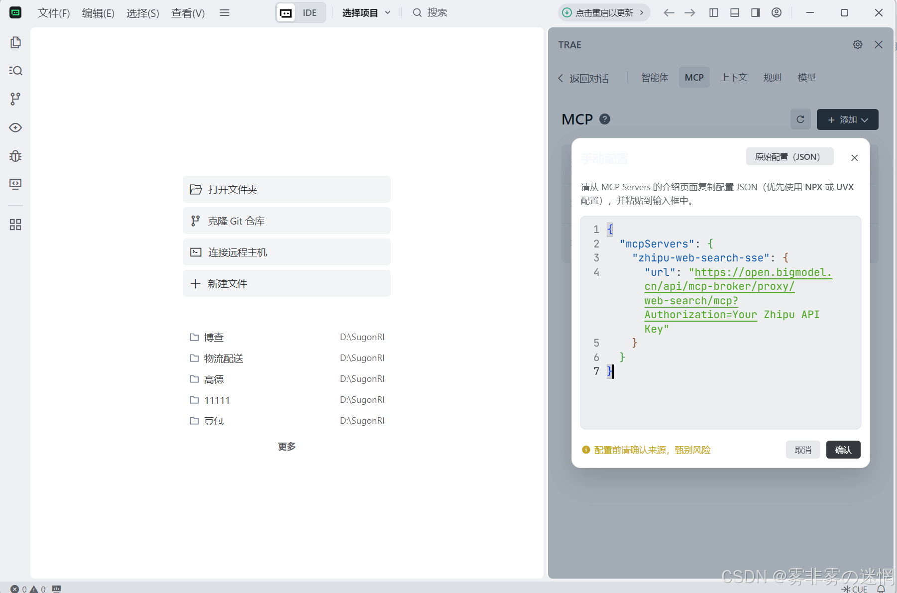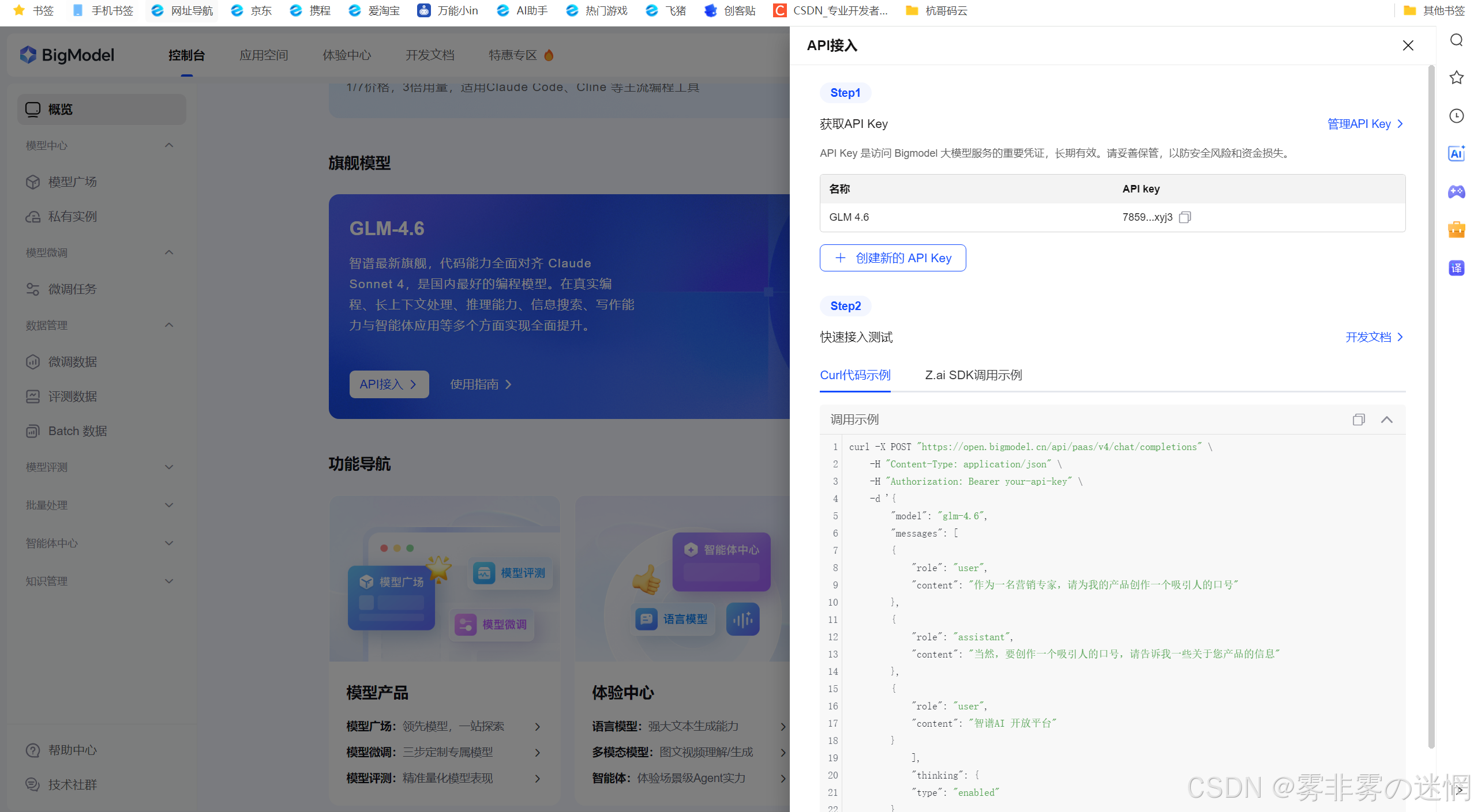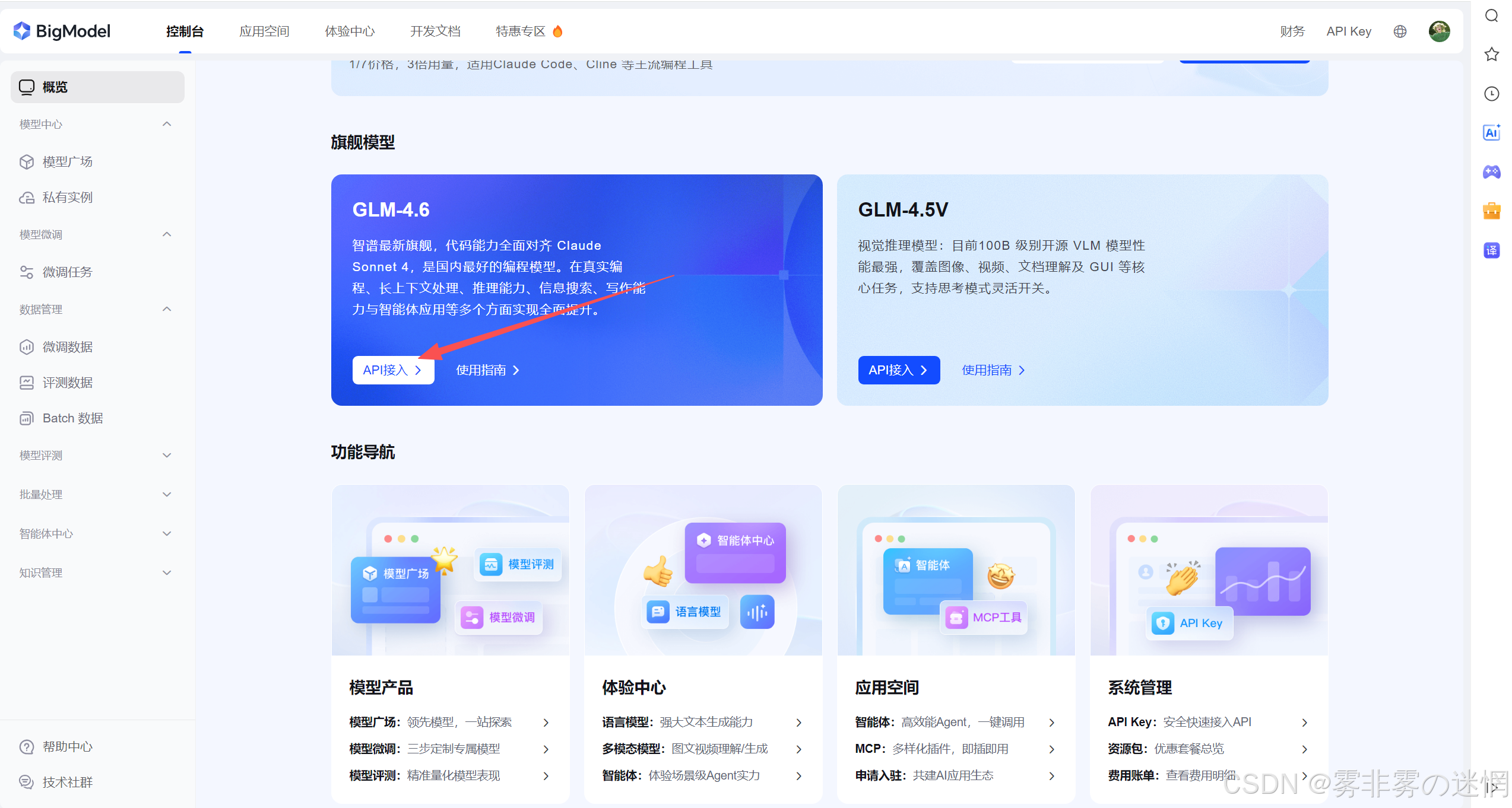 首先我们打开智谱AI文档,按照操作获取API KEY和MCP调用: