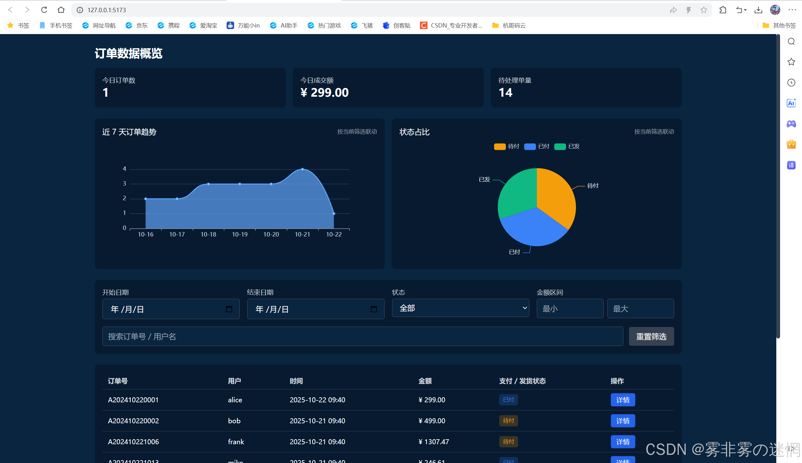 - 数据概览:统计今日订单数、GMV、待处理单量;图表区展示最近 7 天订单趋势与状态占比,随筛选实时联动。