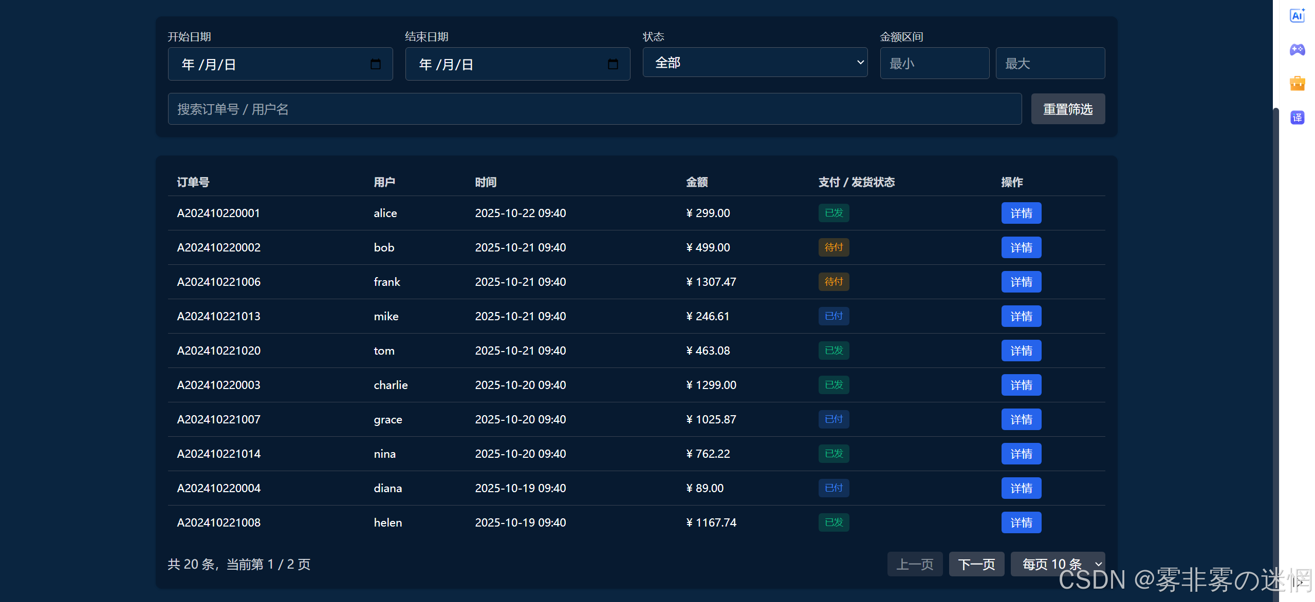 - 列表管理:支持按时间、状态、金额筛选;搜索订单号 / 用户名;表格列点击排序;分页切换。