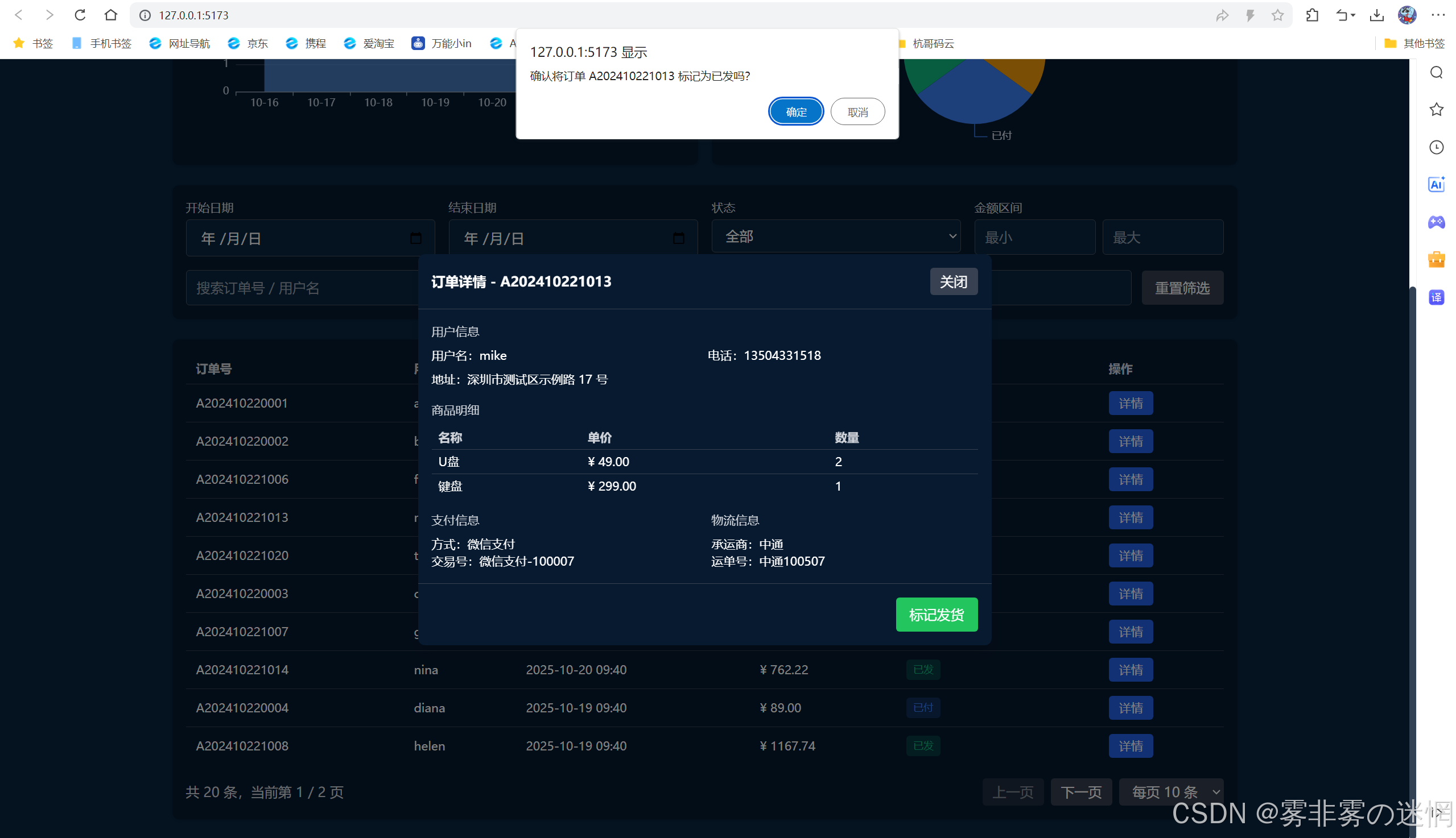 - 详情弹窗:展示用户信息、商品明细、支付与物流信息;当状态为“已付”时显示“标记发货”按钮,操作含二次确认并实时更新统计与图表。