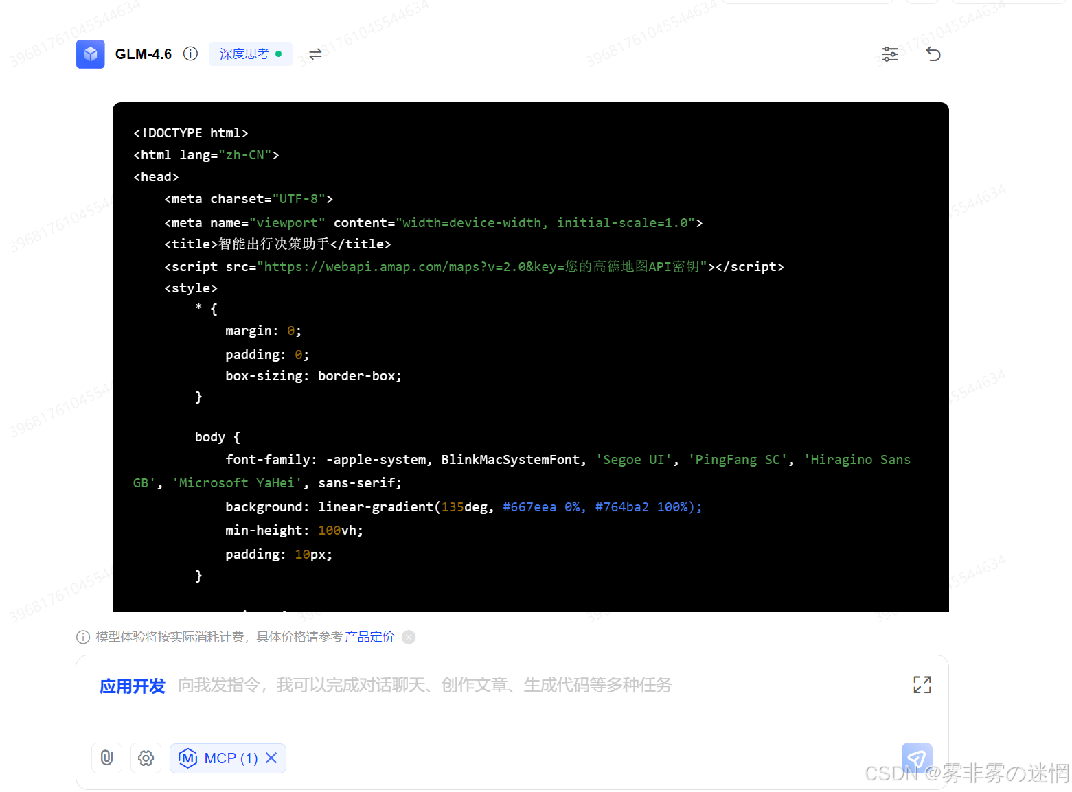 我在智谱 AI 平台的 GLM-4.6 对话框中,输入 “用 HTML + 高德地图 API 开发智能出行决策助手,要地址输入、路径规划、天气、周边服务” 的提示词后,模型几乎秒级理解了需求边界。不到 5 分钟,一个包含完整源代码结构就生成了 —— 打开后发现,HTML 里不仅正确引入了高德地图的 JS SDK,还把 “自动定位当前位置” 的逻辑做了优雅封装:当用户未开启定位时,会弹出友好的手动输入提示!