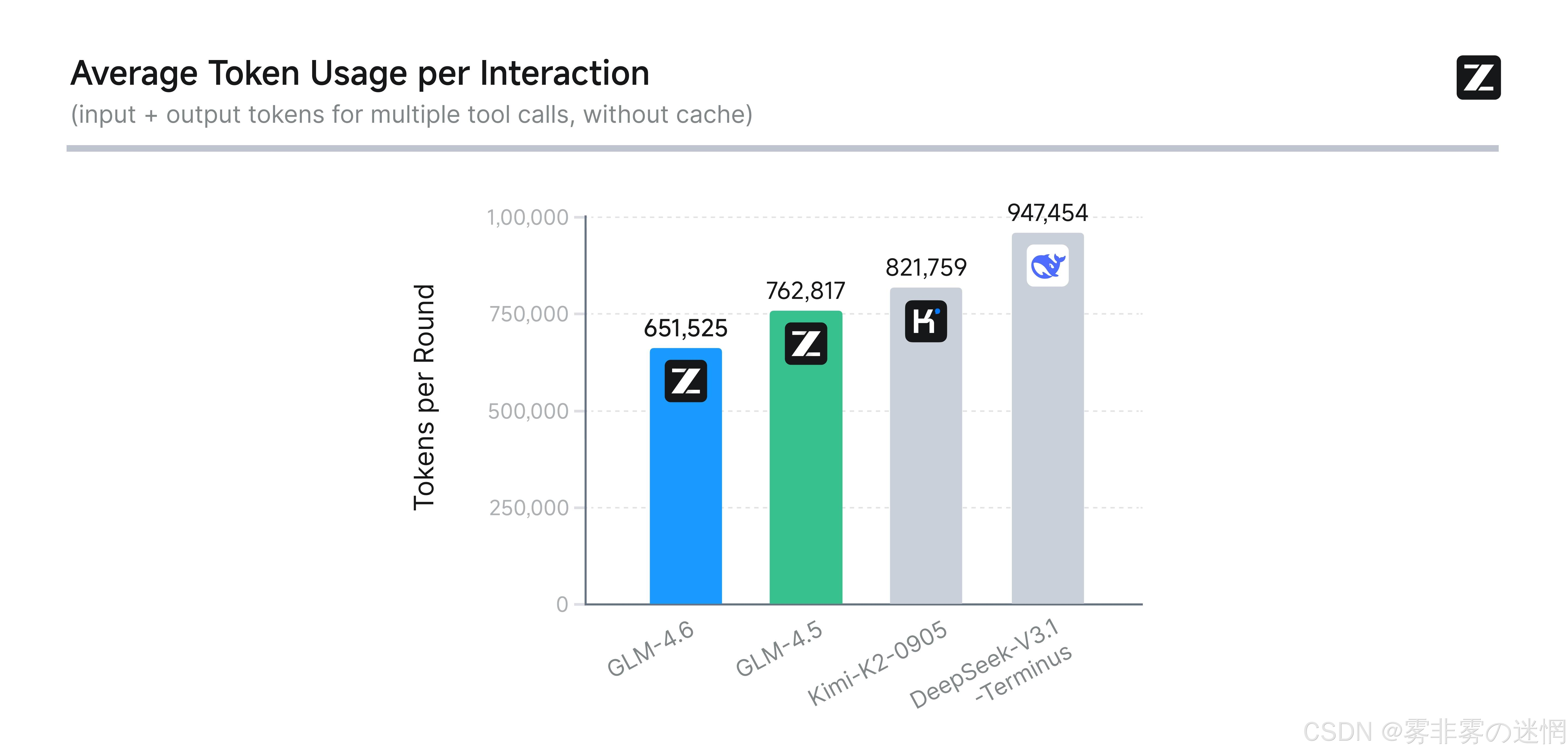 在平均token消耗上,GLM-4.6 比 GLM-4.5 节省 30% 以上,为同类模型最低