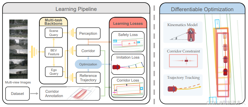 多任务主干网络将多视角图像作为输入进行处理,并输出感知结果、参考轨迹以及可行区域(走廊)。
