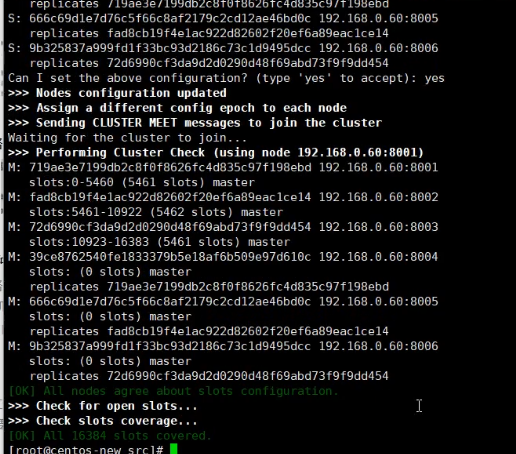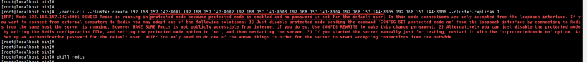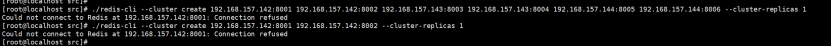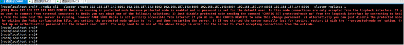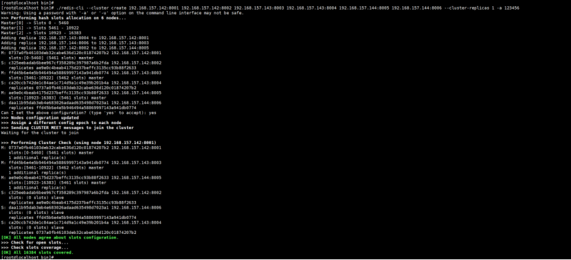 ./redis-cli --cluster create 192.168.157.142:8001 192.168.157.142:8002 192.168.157.143:8003 192.168.157.143:8004 192.168.157.144:8005 192.168.157.144:8006 --cluster-replicas 1 -a 123456)