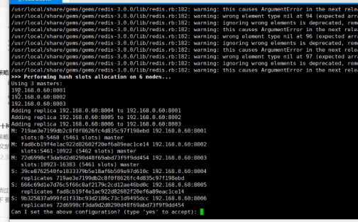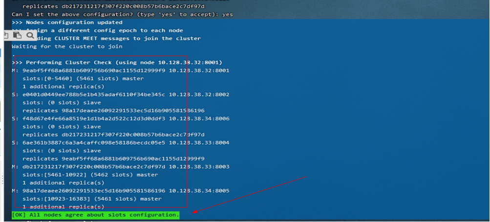 ./redis-trib.rb create --replicas 1 10.128.38.32:8001 10.128.38.32:8002 10.128.38.33:8003 10.128.38.33:8004 10.128.38.34:8005 10.128.38.34:8006