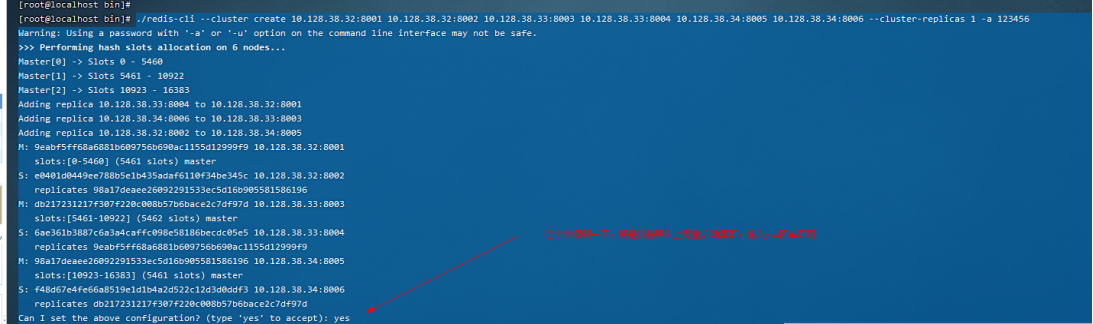 ./redis-cli --cluster create 10.128.38.32:8001 10.128.38.32:8002 10.128.38.33:8003 10.128.38.33:8004 10.128.38.34:8005 10.128.38.34:8006 --cluster-replicas 1 -a 123456