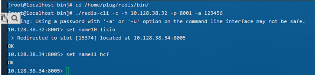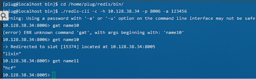 [plug@localhost bin]$ ./redis-cli -c -h 10.128.38.34 -p 8006 -a 123456