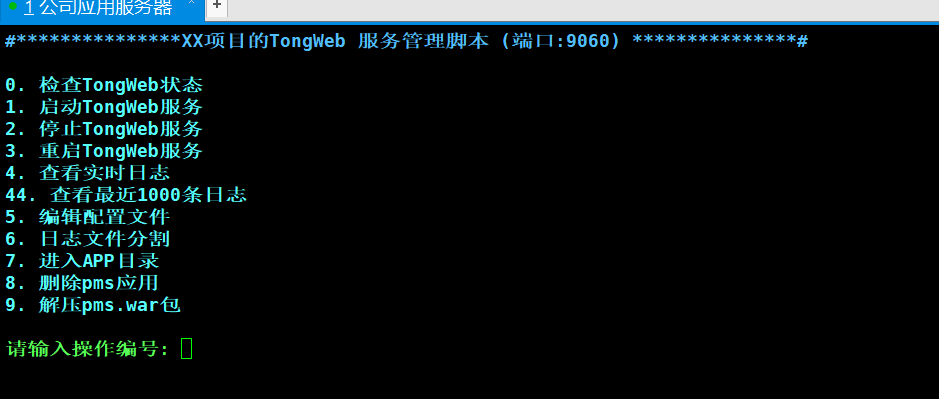 show_menu() {echo -e "${CYAN}"echo "0. 检查TongWeb状态"echo "1. 启动TongWeb服务"echo "2. 停止TongWeb服务"echo "3. 重启TongWeb服务"echo "4. 查看实时日志"echo "44. 查看最近1000条日志"echo "5. 编辑配置文件"echo "6. 日志文件分割"echo "7. 进入APP目录"echo "8. 删除hcf应用"echo "9. 解压hcf.war包"echo -e "${NC}"echo -e "${GREEN}请输入操作编号: ${NC}\c"