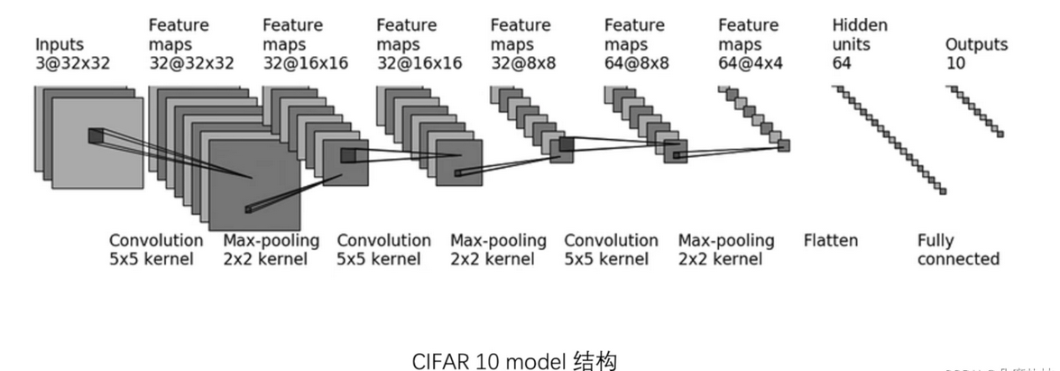 dataloader=DataLoader(dataset=dataset,batch_size=64)class Module(nn.Module):def __init__(self):super(Module,self).__init__()self.model1 = Sequential(Conv2d(3, 32, 5, padding=2),MaxPool2d(2),Conv2d(32, 32, 5, padding=2),MaxPool2d(2),Conv2d(32, 64, 5, padding=2),MaxPool2d(2),Flatten(),Linear(1024, 64),Linear(64, 10))def forward(self, x):x = self.model1(x)return x#使用交叉熵损失函数