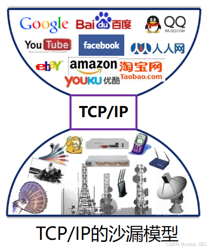沙漏的细腰:就是 IP层。IP协议是互联网唯一的、共同的“语言”。所有上层应用(HTTP, FTP, SMTP等)和下层网络技术(以太网、WiFi、4G/5G等)都必须通过IP层进行通信。