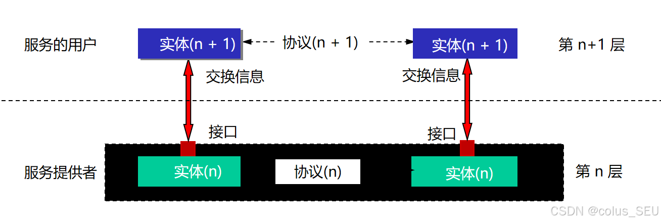 接口:相邻层之间交换信息的连接点。上层通过接口使用下层的服务。