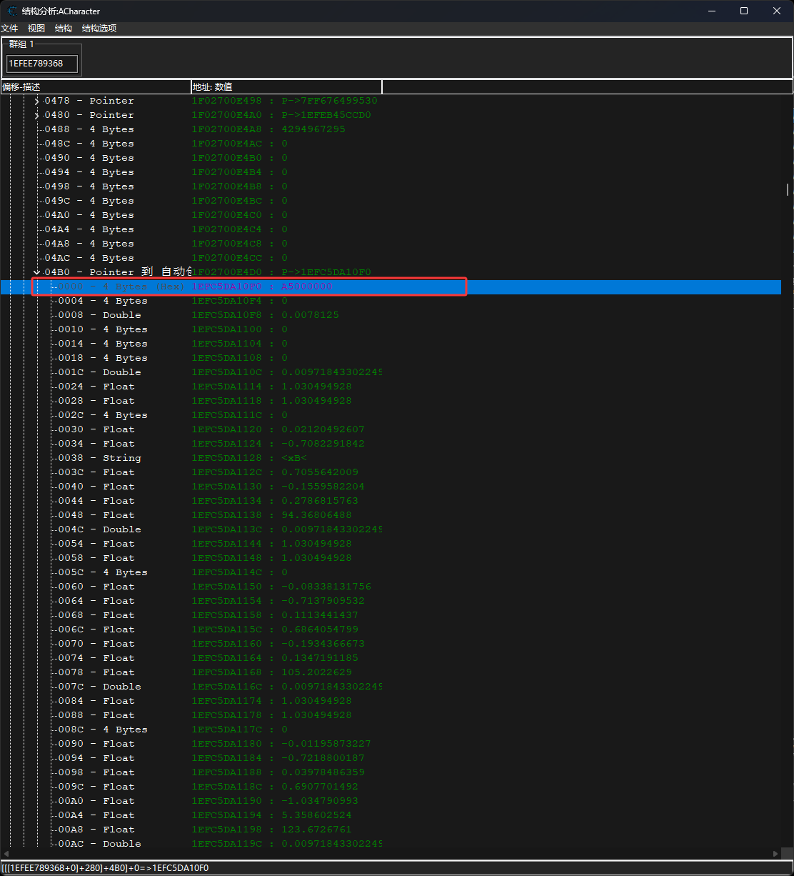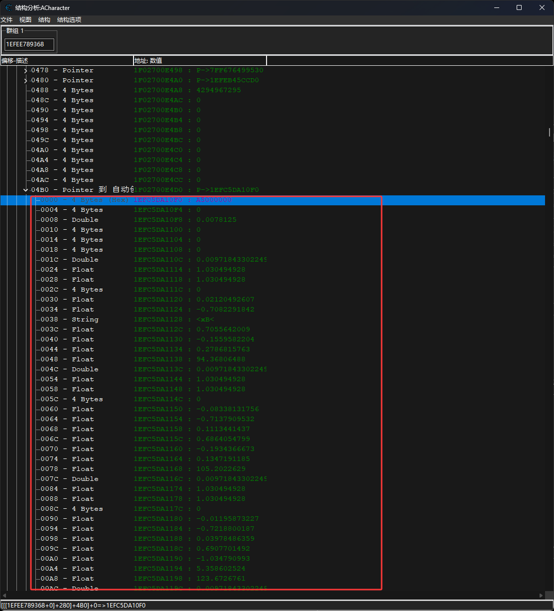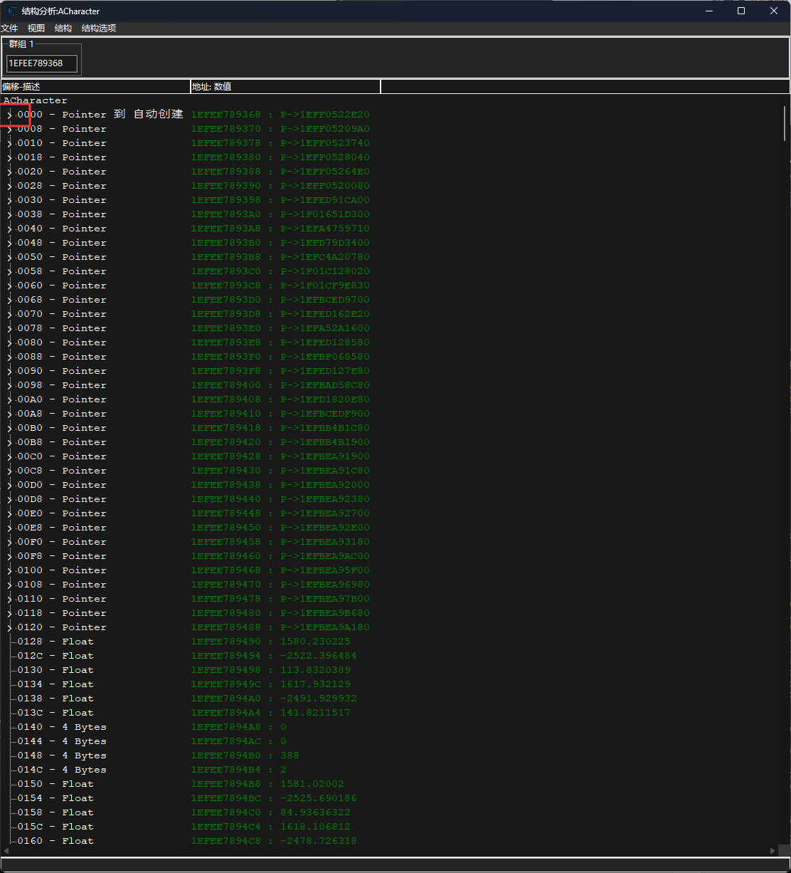 首先点击下图红框,上方找到的地址里的存放了ACharacter的地址,所以要点击下图红框,进入ACharacter中