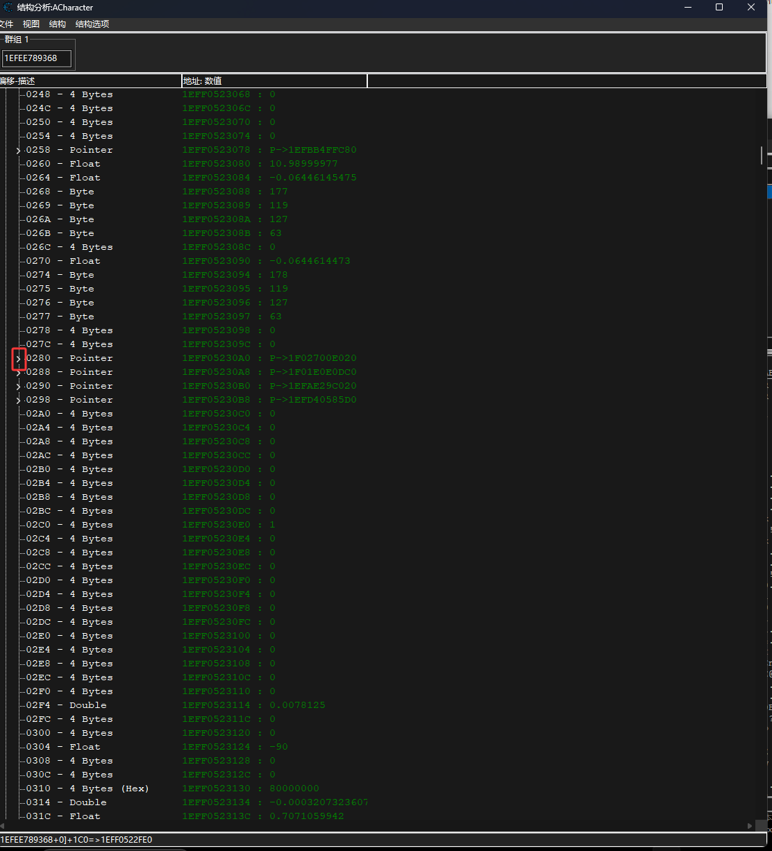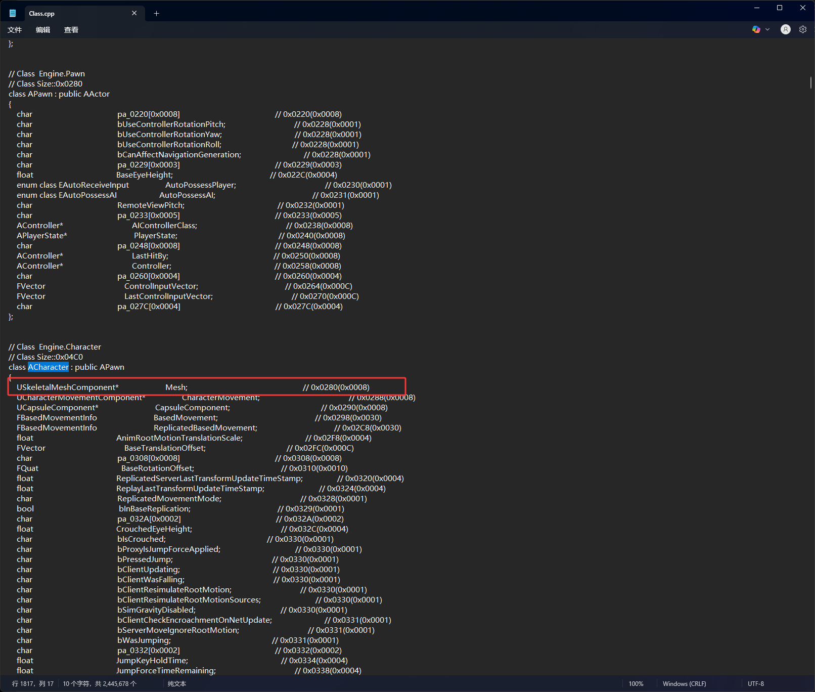 接下来就来找骨骼在ACharacter什么位置,首先进入ACharacter中,找下图红框0x280位置