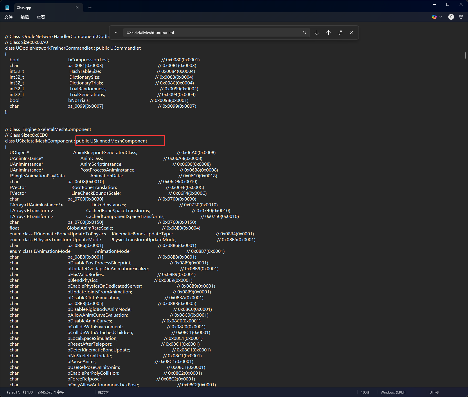 然后点击下图红框,也就是280位置的箭头,进入USkeletalMeshComponent中从而进入USkinnedMeshComponent中