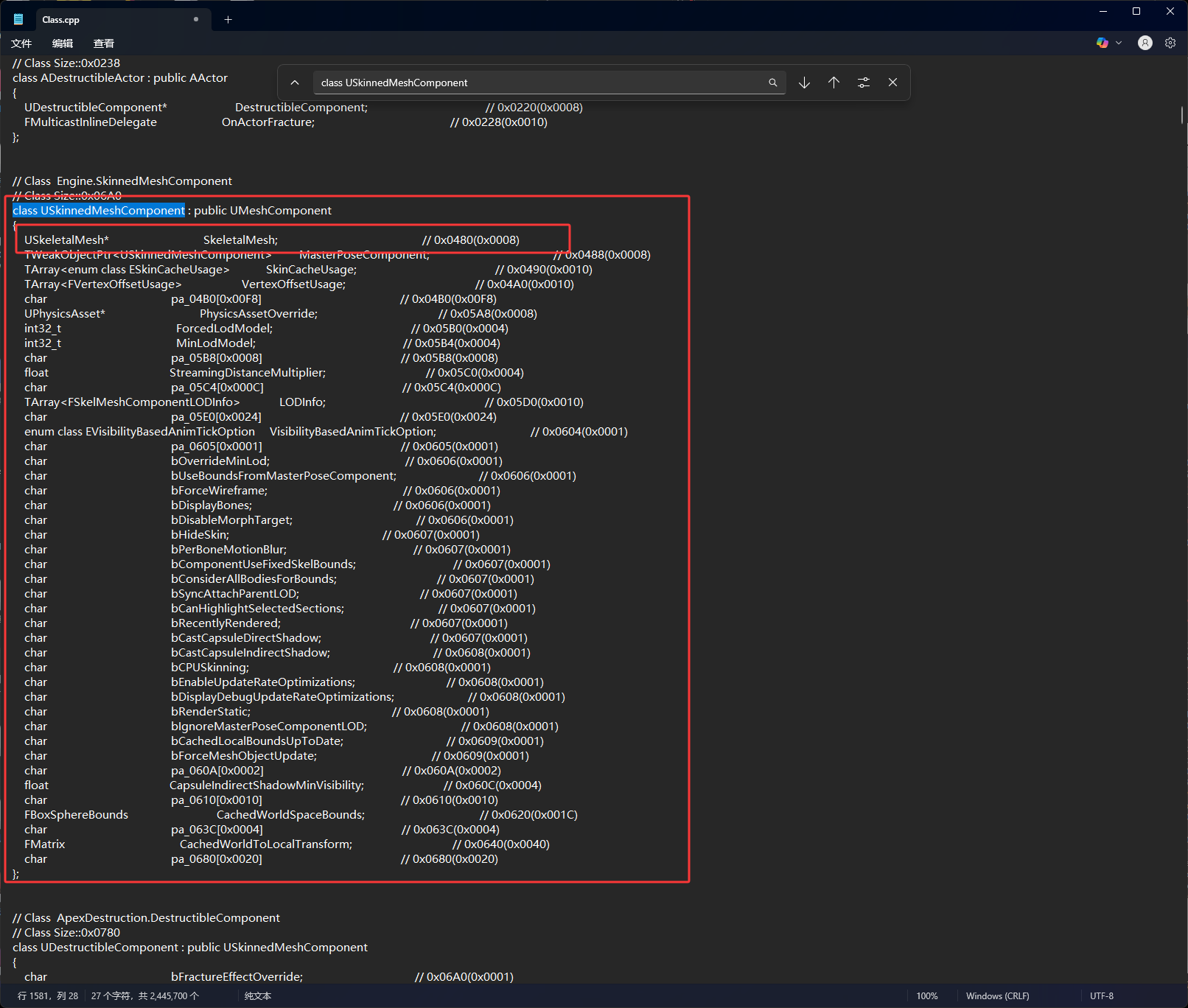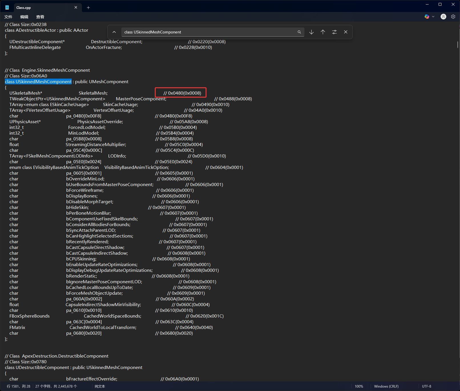 骨骼的信息就在下图红框里面,也就是USkinnedMeshComponent中,这个偏移是从0x480位置开始看