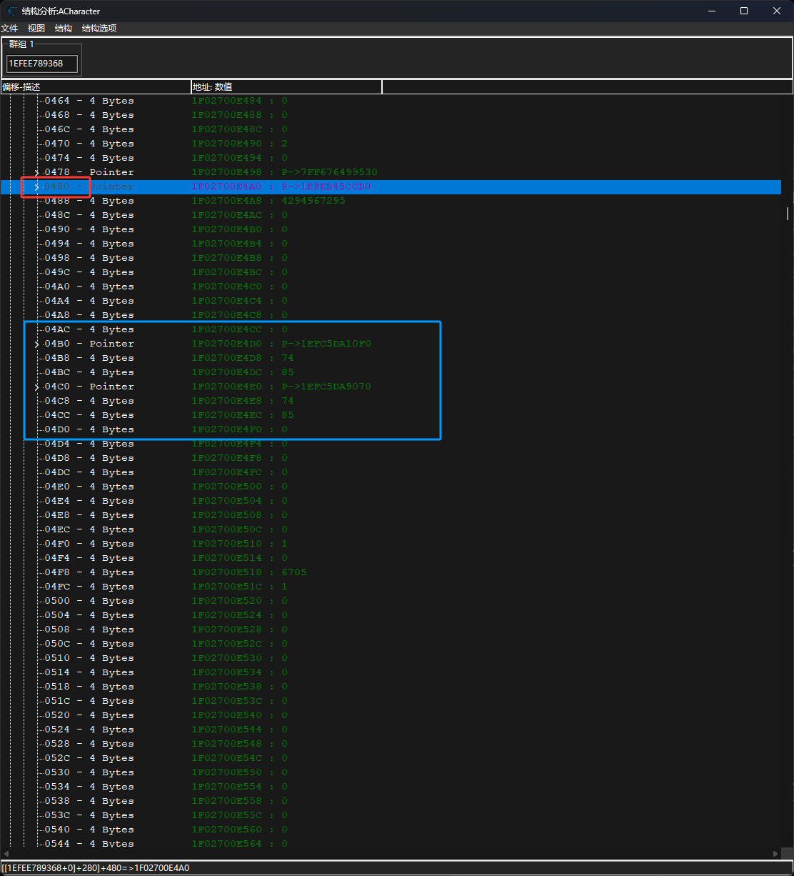 然后来到480位置,然后找TArray结构,0x4B0,也就是类似下图蓝框的数据结构