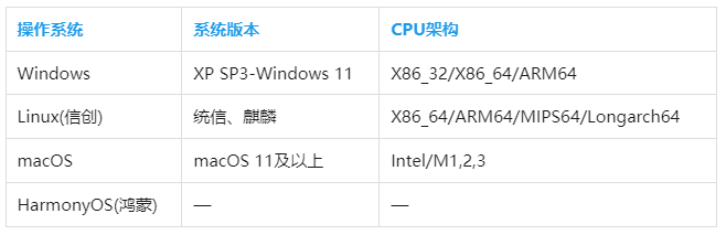 - 支持的操作系统汇总如下: