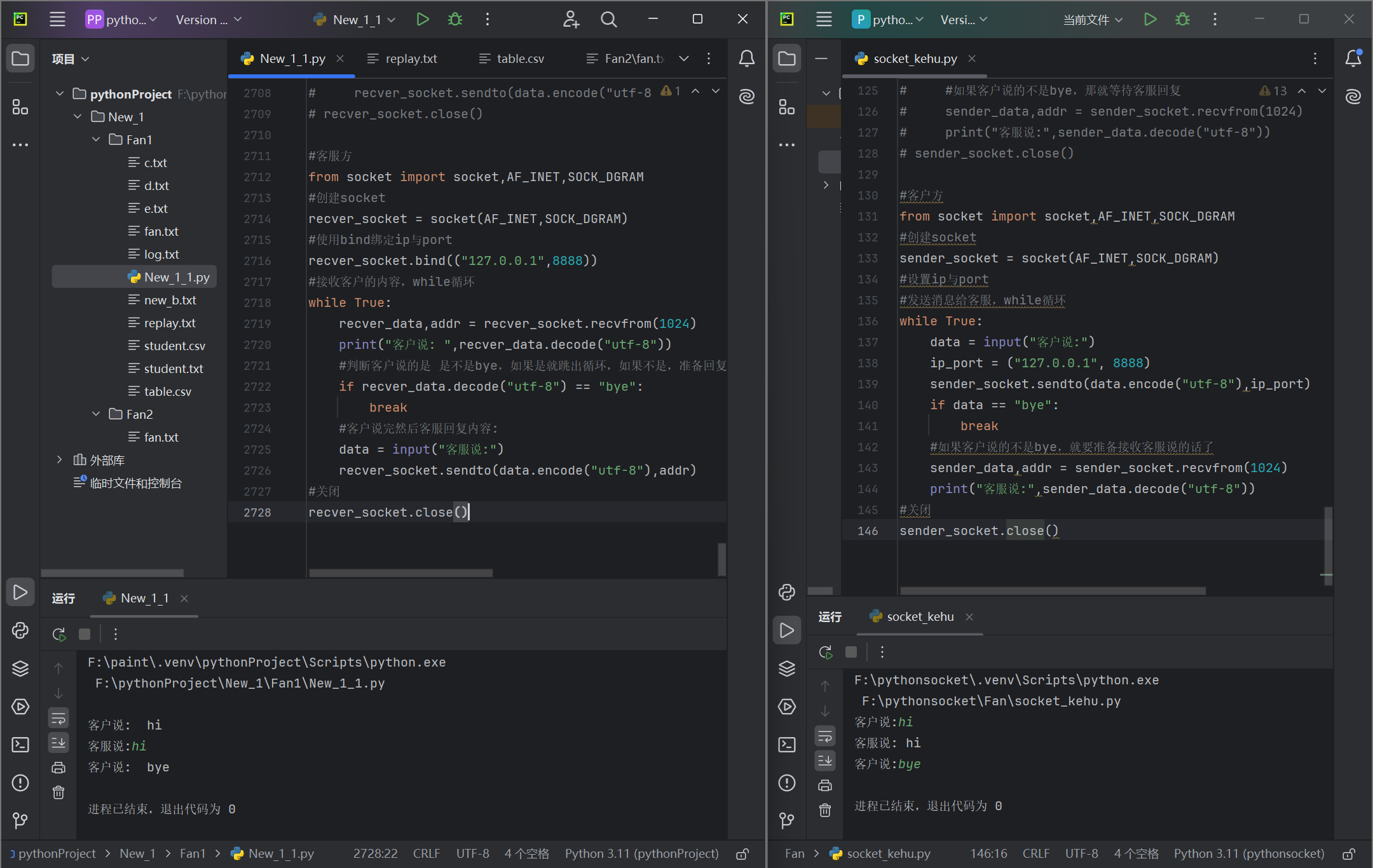 while True:data = input("客户说:")ip_port = ("127.0.0.1", 8888)sender_socket.sendto(data.encode("utf-8"),ip_port)if data == "bye":break#如果客户说的不是bye,就要准备接收客服说的话了sender_data,addr = sender_socket.recvfrom(1024)print("客服说:",sender_data.decode("utf-8"))