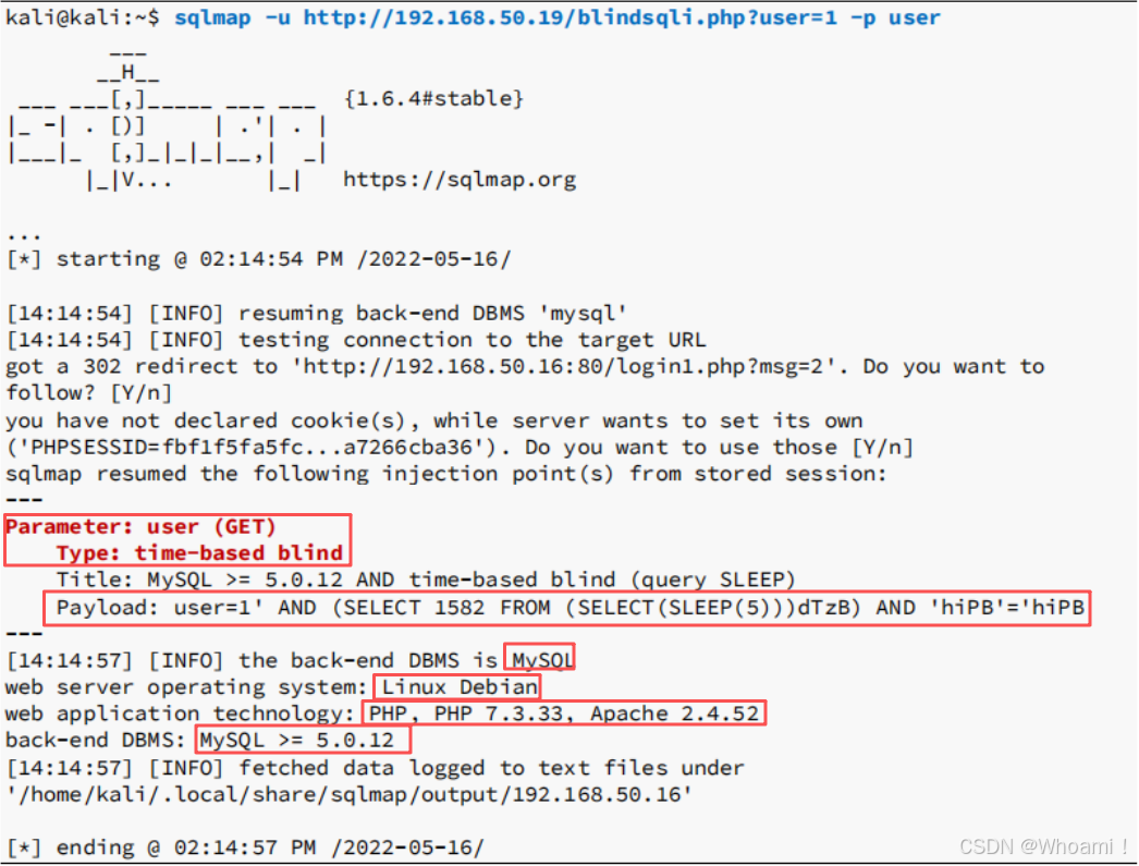 # 基本语法 $ sqlmap -u [目标URL] -p [参数名]# 实际示例 $ sqlmap -u http://192.168.50.19/blindsqli.php?user=1 -p user