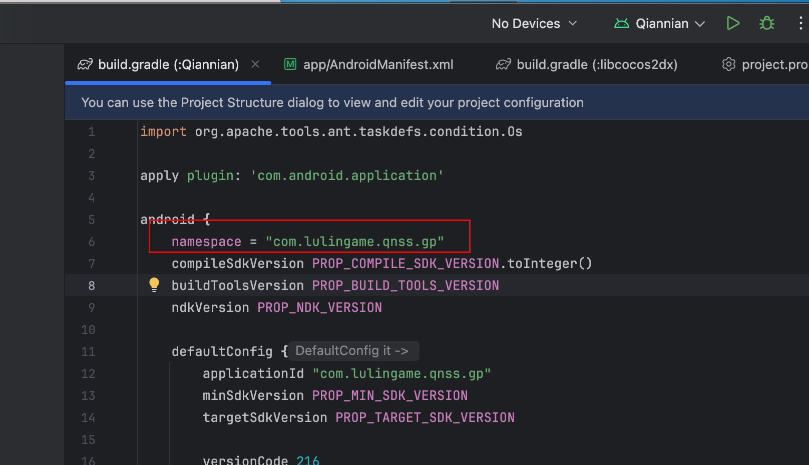 (3)如果遇到 jsb-default/frameworks/runtime-src/proj.android-studio/instantapp/AndroidManifest.xml 的提示,同理