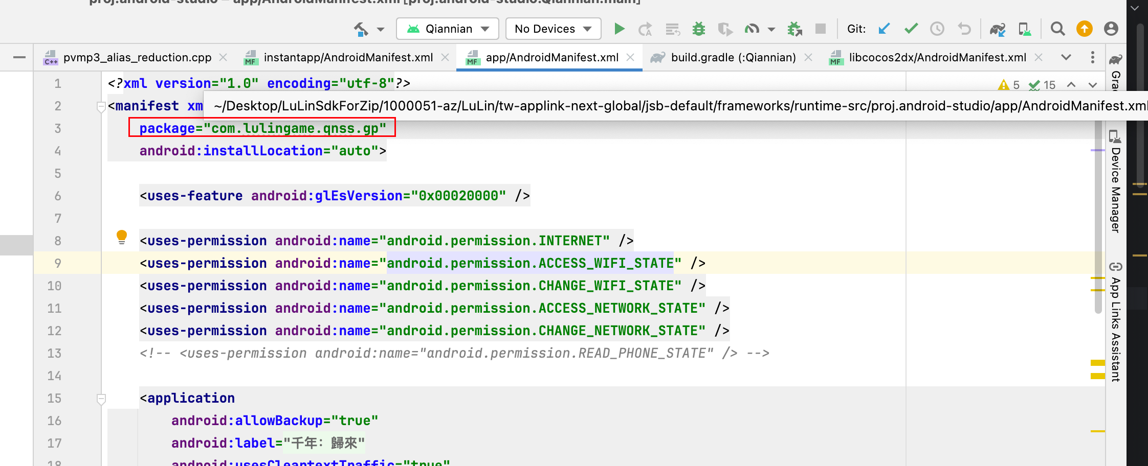 (1)修改后原始工程下中jsb-default/frameworks/runtime-src/proj.android-studio/app/AndroidManifest.xml