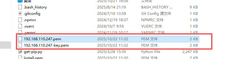 生成nginx用到的私钥和证书文件,直接mkcert加上你的ip即可,然后会在你执行命令的当前目录生成两个文件
