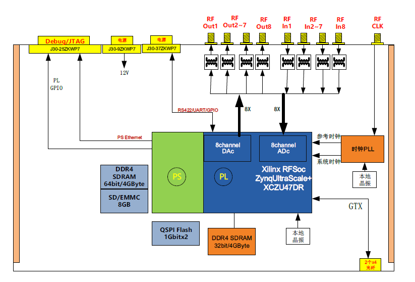 RFSOC47DR数模混合信号处理卡,采用Xilinx ZYNQ UltraScale+ RFSoC ZU47DR,实现了8路ADC和8路DAC 端口,并支持外部同源参考时钟。对外J30J上支持27路双向GPIO、2组RS422、1组RS485、2组Uart以及1个千兆网口,ADC最高采样率4.096GSPS 和DAC最高采样率6.5536 GSPS 。