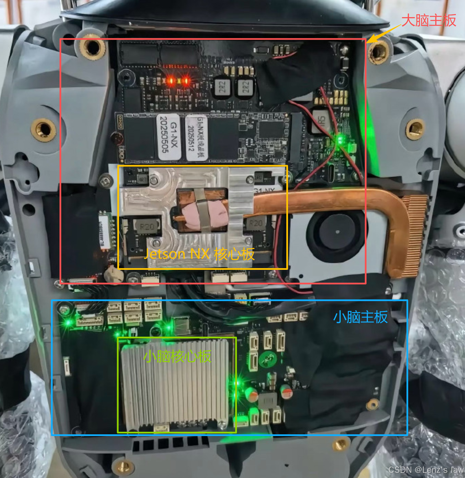 宇树G1主控电路板放置在胸腔,分为两大主要部分: