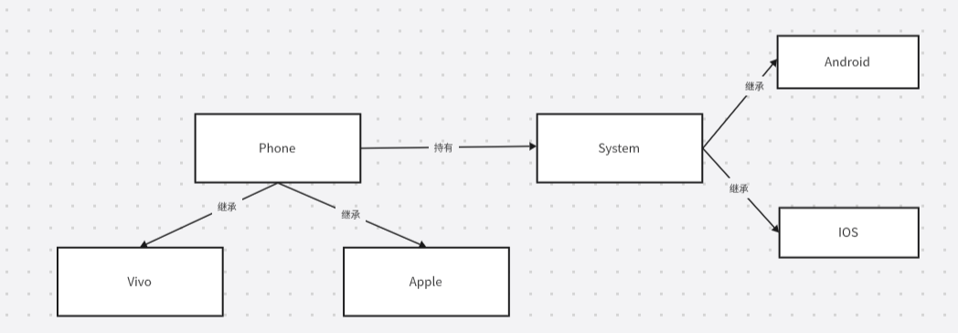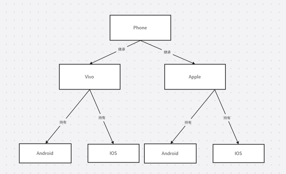 可以看到,每个品牌的手机都要重复实现对应的系统(比如 Vivo 要做 Vivo+Android、Vivo+IOS,Apple 要做 Apple+Android、Apple+IOS)。当新增一个品牌(如‘小米’)或新增一个系统(如‘鸿蒙’)时,需要新增的实现类数量会成倍增加(新增品牌要适配所有现有系统,新增系统要被所有现有品牌适配)。这种方案不仅冗余,还会导致“类爆炸”,维护成本极高。(实现类的个数为2×2=4,增加一个品牌将变成3×2=6)