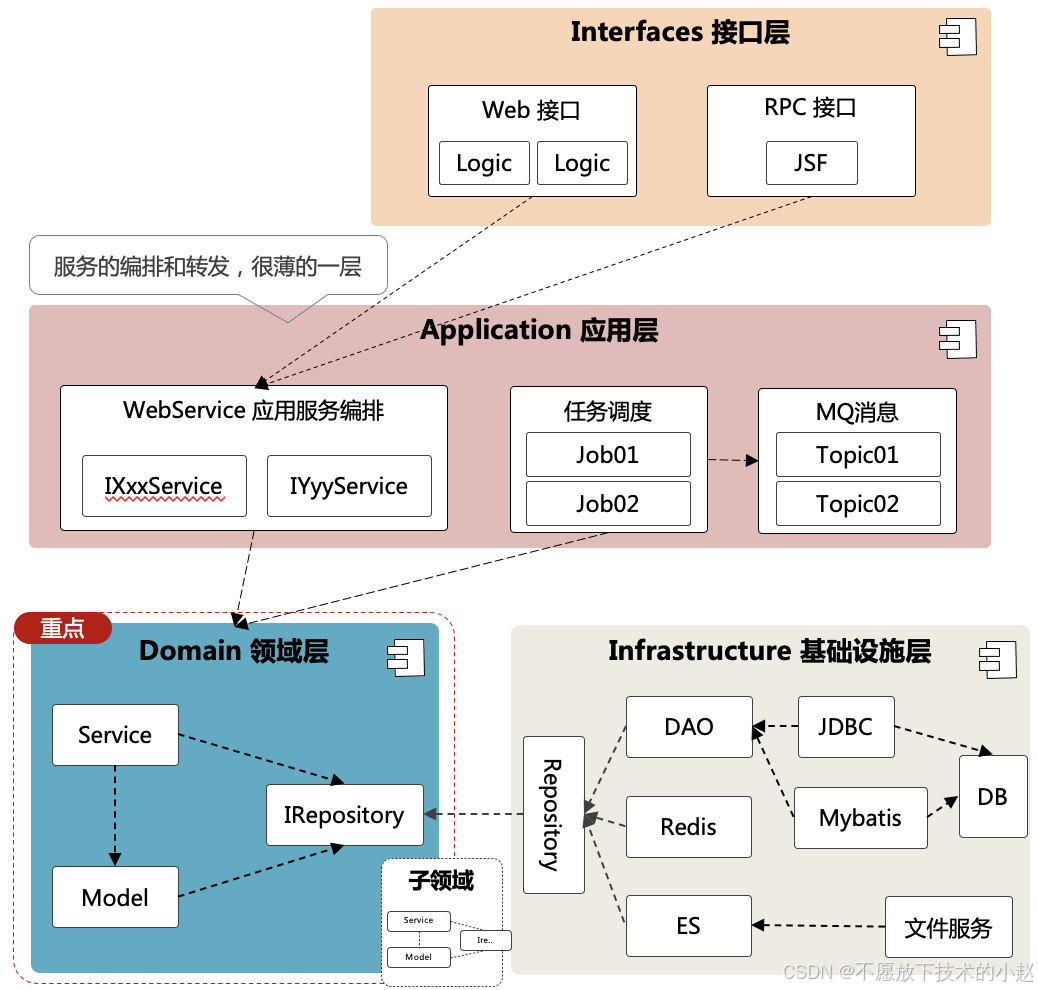 - DDD 的分层结构更注重 Domain 领域层的实现,由很薄的应用层定义接口和编排接口,由领域层做具体的实现。