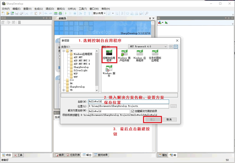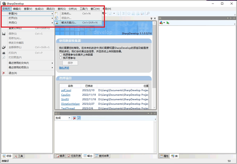 1) 首先打开 SharpDevelop,然后依次选择菜单项“文件”=>“新建”=>“解决方案”: