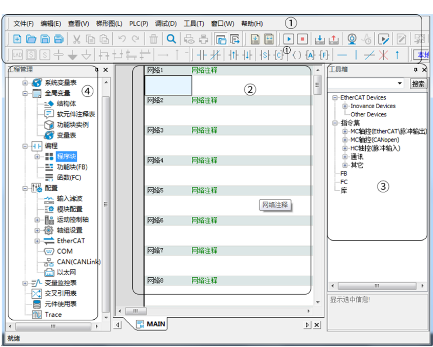 ① 主菜单和快捷工具:编程软件操作菜单,包含编程、调试、通信等相关设置,文件管理与编程调试工具的 快捷方式;