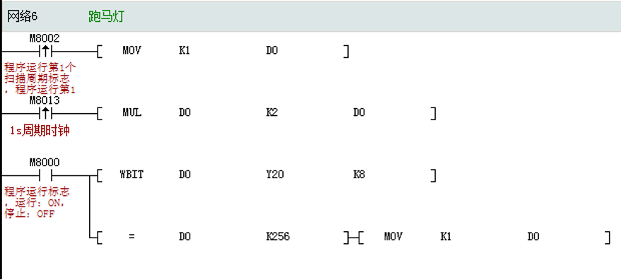 第三行程序,利用以为指令WBIT,将D0的值赋给Y20开始的接下来的8位,那么这8盏灯会按照D0的值进行二进制亮灭。当D0=256时,重新开始循环。